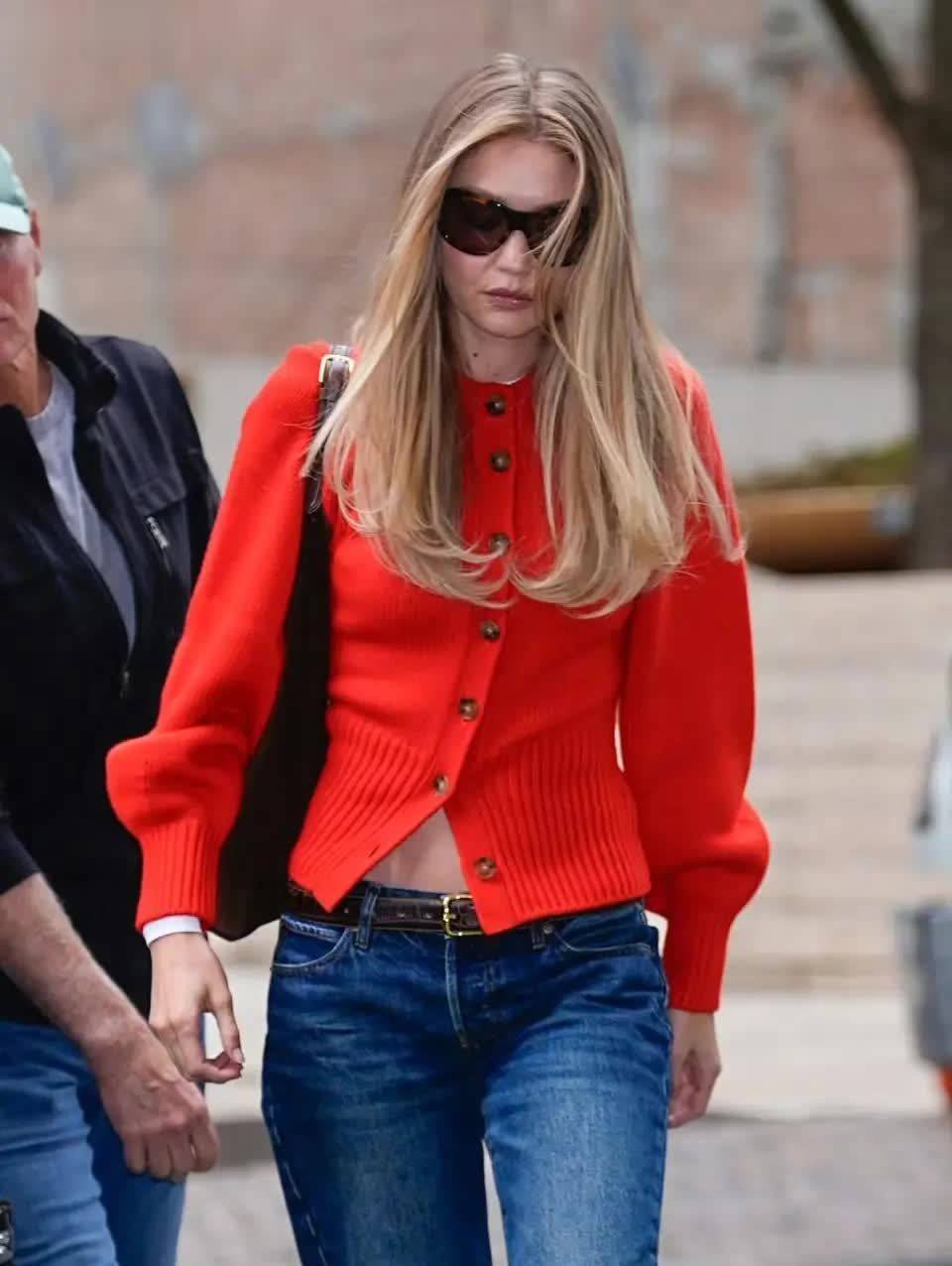 这次和男友一起出现在纽约是因为Gigi有了新的工作!她需要为某时尚品牌拍大片!不过私服来自自己创立的品牌!这件橘红色灯笼袖设计的针织衫,在袖口设计上满满的少女心!